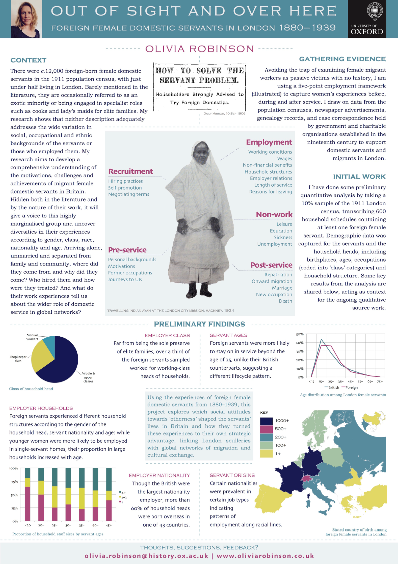 The winner of the £100 prize was Olivia Robinson of the University of Oxford for her poster on the topic ‘Out of sight and over here: foreign female domestic servants in London 1880-1939 (click here for a close-up view of the winning poster)