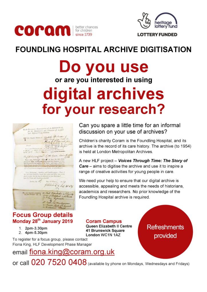 Coram are holding two focus groups in London to discuss best practice in digital archives on Monday 28 January. Refreshments will be provided and no prior knowledge of the Foundling Hospital archive is required.