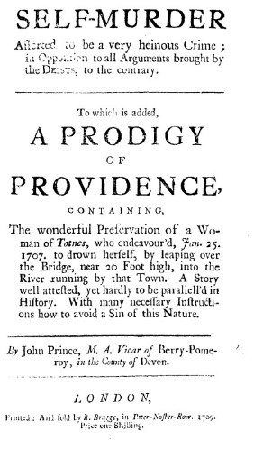 [1] J. Prince, Self-Murder asserted to be a very heinous crime; in opposition to all arguments brought by the Deists, to the contrary (1709).
