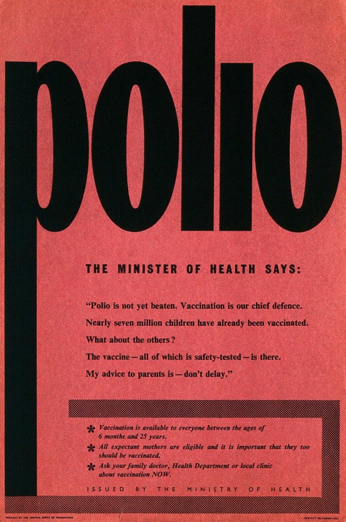 To persuade young people, the government sought to play on their emotions and to reach them where they worked and recreated. This involved more than adding the under-26s to polio posters and reassuring them that the vaccine was safe, and available – as they had when targeting parents. Vaccine drives and posters were placed in the spaces young people worked and played, and a new set of posters tailored to entice this cohort into registration was commissioned. New posters aimed at unattached under-26s were dominated by representations of youthful independence – dancing, working, and dating.