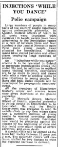 ‘Injections ‘while you dance’’, announced the slightly bizarre Manchester Guardian headline from April 8th 1959. At first conjuring an outlandish image of dancers being pricked with needles as they boogied, the short article actually described ongoing attempts by health authorities across Britain to ensure polio immunisation reached the under 25s. In triumphant tones it explained that ‘medical teams’ would be visiting ‘factories’ and that ‘youth and dance halls’ were being approached ‘with a view to sending teams to give injections to young people.’ It noted ‘clubs and halls’ dance records will be interrupted for propaganda announcements’, that ‘members of Manchester United’s senior and reserve teams were given injections at the ground yesterday’ and that ‘mobile’ clinics were being made available ‘to any firms where there was a sufficient number of young people’. Why were these attempts to increase polio immunisations among the under 25s newsworthy? Why were the under 25s such a problem audience? Why were Saturday clinics and mobile clinics being paid for in Manchester? Were under 25s suddenly at greater risk of polio? These are questions I’ve been looking into with Gareth Millward and Alex Mold, and which we’ve written about in our recent article for Cultural & Social History.