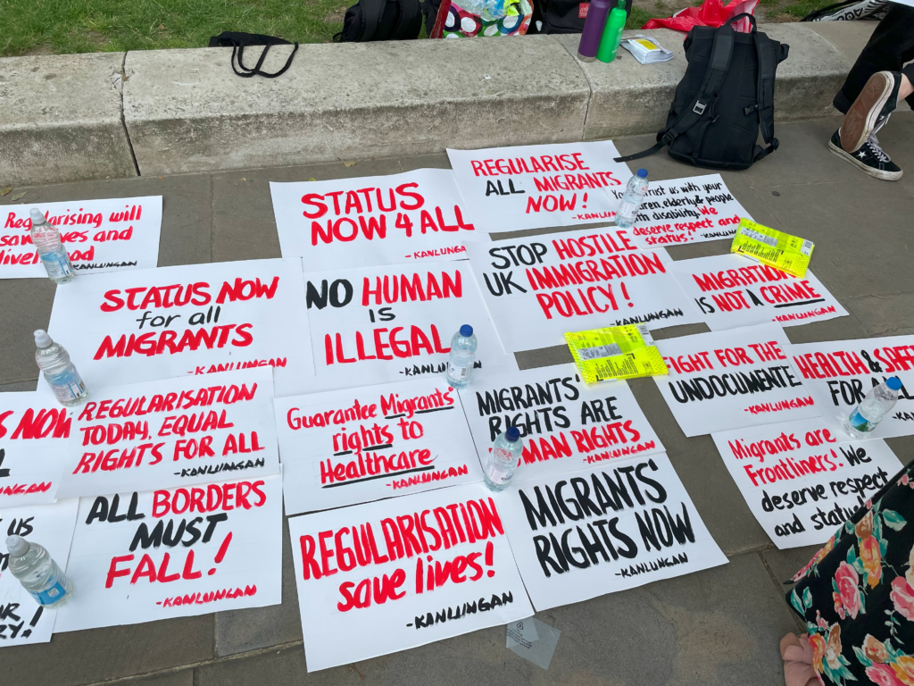 Protest signs outside 10 Downing Street at a solidarity rally for the regularisation of undocumented migrants, 19 July 2021, photo credit: Francesca Humi