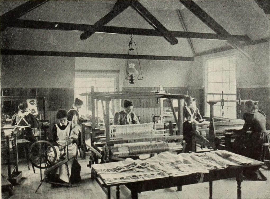 Hand-loom workers at St Cross, Haslemere, as pictured in ‘International Studio: An Illustrated Magazine of Fine and Applied Art’ (1908). Digitised by Brigham Young University, Idaho.