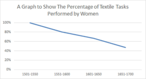 Using this as a starting point for my own analysis, I used this database to analyse women’s decreasing involvement in craft work. Gender divisions were clear in this sector, and most of women’s craft work was in the textile industry. Between 1500 and 1700, the percentage of textile workers that were women decreased by 50%. By observing this shifting demographic some key questions appear. First, did textile work decline in comparison to work in the rest of the craft sector? It did. It declined from 7% to 3% of all work-tasks. Second, was there an increase in men’s textiles jobs without a growth in jobs available to women? Again, the answer is yes, men’s work in textiles increased by just over 50% in this period. Changing export laws in the 1600s, that had previously been very strict, increased focus on exporting finished textile products. Before this Britain had mainly exported undyed products that would be finished in the destinations they were shipped too. This increased demand for workers to finish and dye the wool in Britain- traditionally men’s work. Lastly, were these jobs being moved elsewhere? While the dataset can’t prove this conclusively, it suggests the beginning of a large shift from small scale textile production to large scale textile production that is often associated with the industrial revolution – especially in the north of England. Therefore, while the percentage of women working in textiles declined in the southwest this does not mean there was not an increase elsewhere.