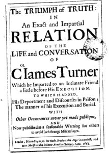 While doing research for my book on rogue pamphlets (narratives of criminals in the sixteenth and seventeenth centuries), I came upon the case of James Turner. As a solicitor who had defrauded many of his clients, Turner was an unlikeable character. Even more egregiously, he betrayed a friend’s trust, by orchestrating the burglary of his friend’s house. Turner was arrested as a robber and his family was implicated in receiving the stolen goods. No one really liked Turner: the diarist Samuel Pepys wrote that everyone was very glad to see him imprisoned ‘so very known a rogue he was’, and he later commented that ‘All [are] desirous of his being hanged’.