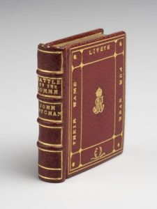 It was also packed with beautiful and very tiny works of art and literature that represented a major shift from their creators’ wartime output. C.R.W. Nevinson’s “Paths of Glory” had been banned in 1918 because of its shockingly unpatriotic content of faceless British corpses lying in the trench mud, but his contribution to the dolls’ house was a pretty watercolour of a mountain town. In 1917, Sir William Orpen had painted “Two Dead Germans in a Trench”, a vivid contrast to his formal portraits of King George and Queen Mary that were hung in the saloon. Robert Graves and Siegfried Sassoon handwrote miniature books for the extensive – around two hundred in total – dolls’ library and John Buchan produced Battle of the Somme, condensing the whole horror of the blood-soaked campaign into a leather-bound volume the size of a postage stamp.