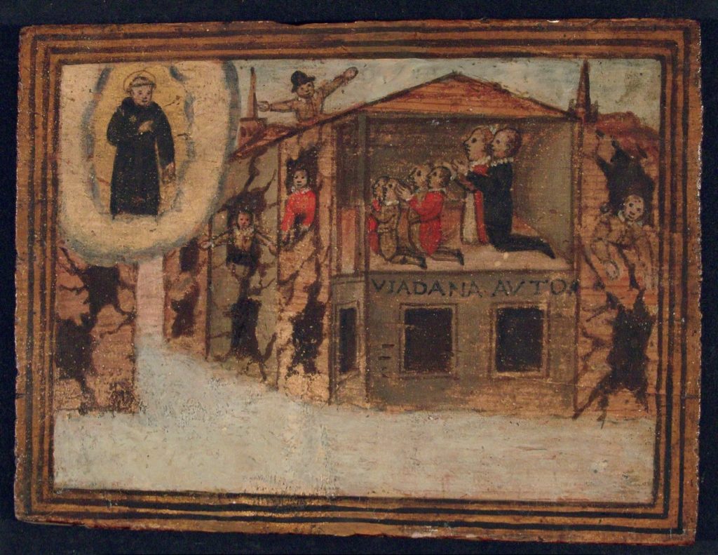 Measuring 20 cm across and painted on a rough wooden board, this startling image records an earthquake in central Italy in the sixteenth century. At the centre of the scene is depicted a nuclear family – mother, father and four neatly dressed children – kneeling in prayer. Around them, neighbours can be seen crying out for help and waving their hands in terror as their houses collapse beneath them. In the top left-hand corner hovers the local saint, Nicholas of Tolentino, who responds to the appeals of the praying family. The painting was commissioned as a gift from the Viadana family to give thanks for their miraculous salvation; their name is written in capitals across the front of their house. But it is also a gift for the social historian: an evocative document of a community in crisis, rendered all the more immediate thanks to its unpolished material form.