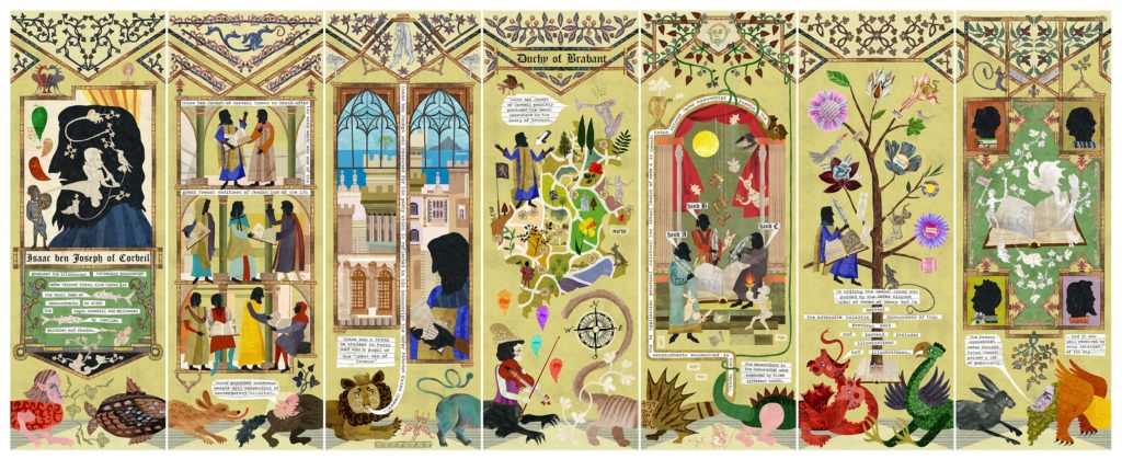 As part of this commission, I am planning an exhibition and delivering outreach activities programme comprising of comics/(hi)story-telling demonstrations and workshops in Manchester Jewish community sites to showcase the project, captivate public’s interest and widen understanding of artefacts, Jewish history, and Jewish studies. I am also designing merchandise based on the commission which will be available in The John Rylands Library’s shop as well as writing blog entries which communicate my research, thinking, design decisions, processes and approaches when visually responding to the manuscript. My comic strip pillars will become part of The University of Manchester’s permanent collections in The John Rylands Library.